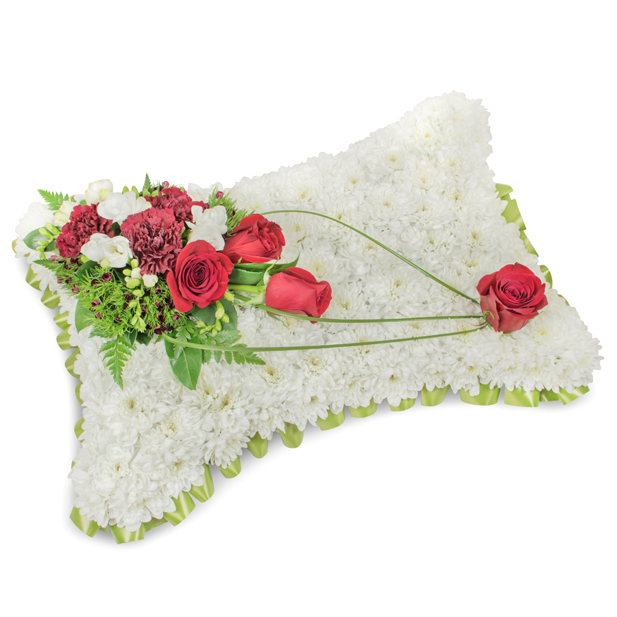 Convey your heartfelt condolences with our elegant sympathy floral arrangement, meticulously designed to offer comfort and beauty. This exquisite bouquet features a graceful mix of white chrysanthemums, red roses, white freesias, dark red carnations, dianthus, and bear grass.