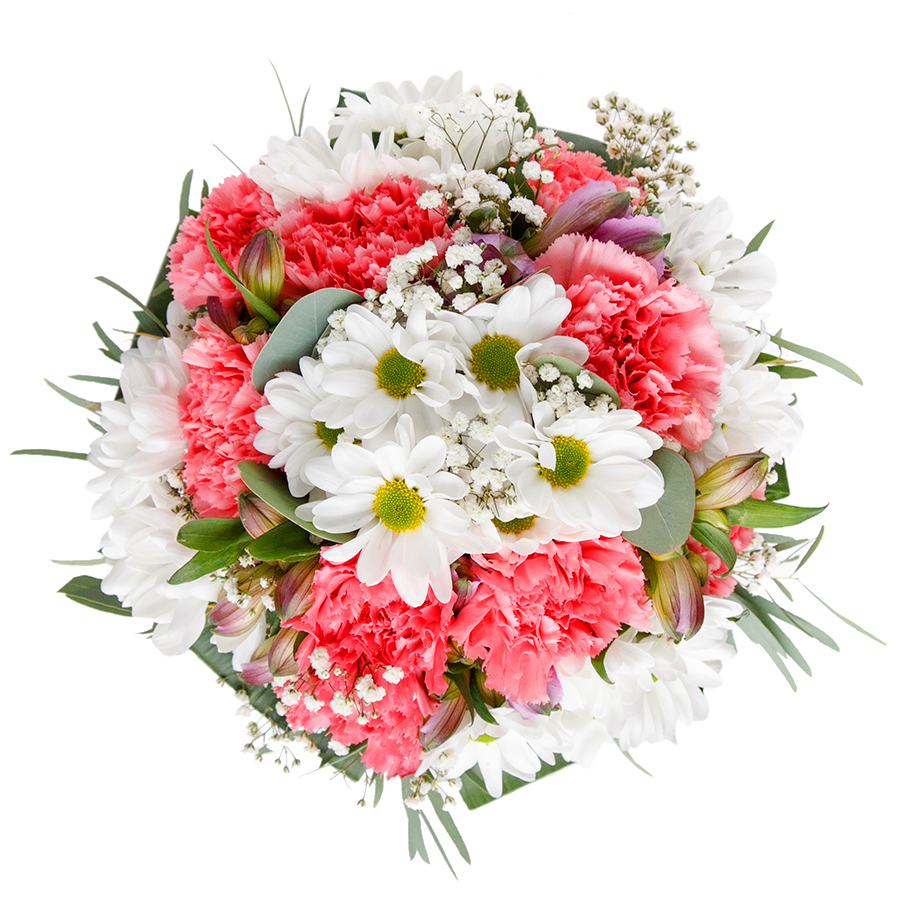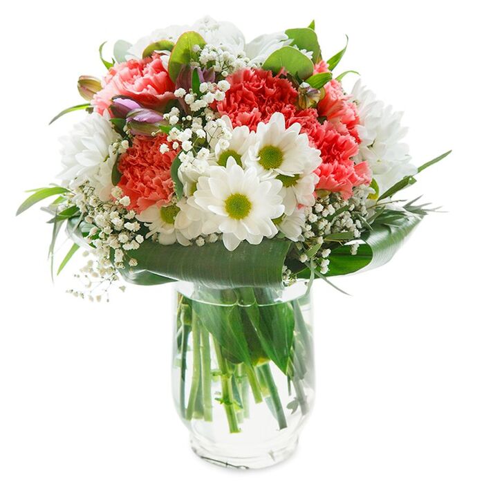 Brighten someone's day with our elegant and unique flower bouquet. Featuring a soft palette of white chrysanthemums, airy gypsophila, and charming light pink carnations, all beautifully arranged with aspidistra leaves.
